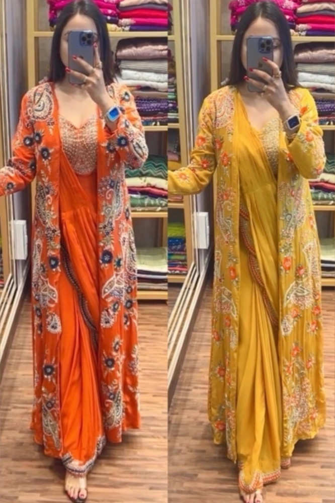 WE ARE LAUNCHING NEW SUPERHIT TRENDING READY TO WEAR SAREE WITH FULLY EMBROIDERED KOTI ON CHINON FABRIC WITH STITCH BLOUSE