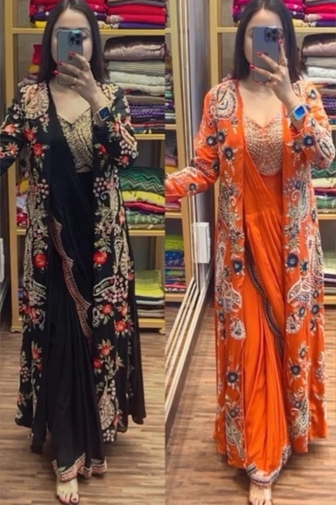 We are launching new superhit trending ready to wear saree with fully embroidered Koti on Chinon fabric with stitch Blouse