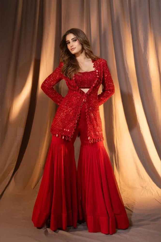 Beautiful Blooming Georgette Fabric Crop- Top, Jacket & Gharah style Plazo with Crape Lining and Original mirror Lace Work…